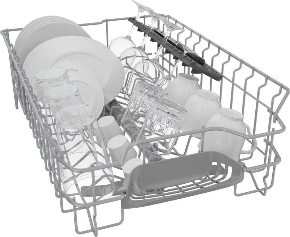 • Standard 3rd rack provides the perfect space for silverware and large utensils, while its V shape leaves room below both sides for taller items like stemware. Also includes a lower rack silverware basket
