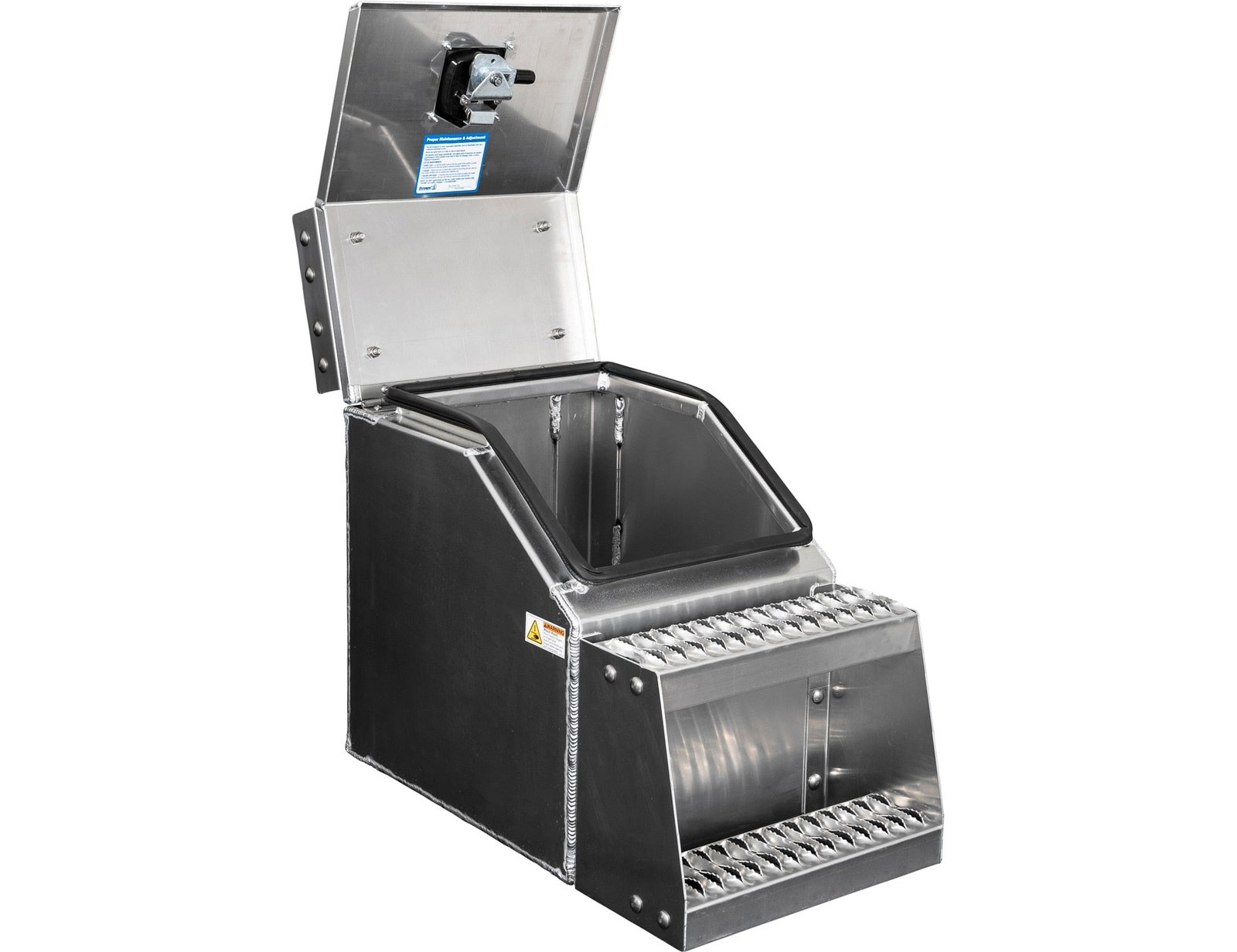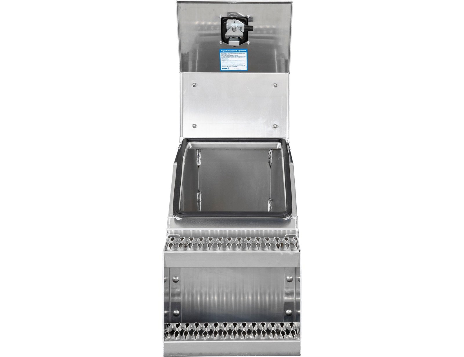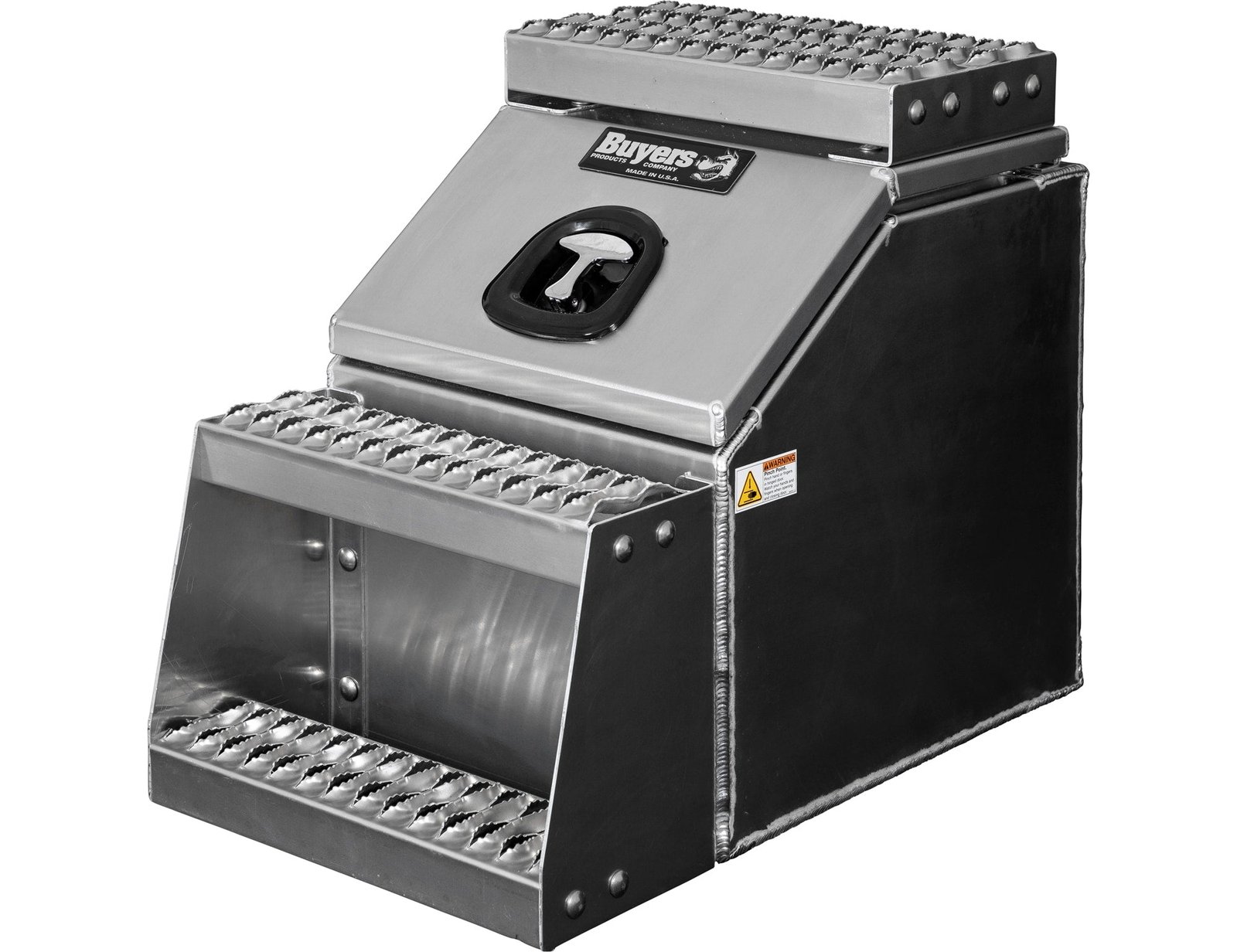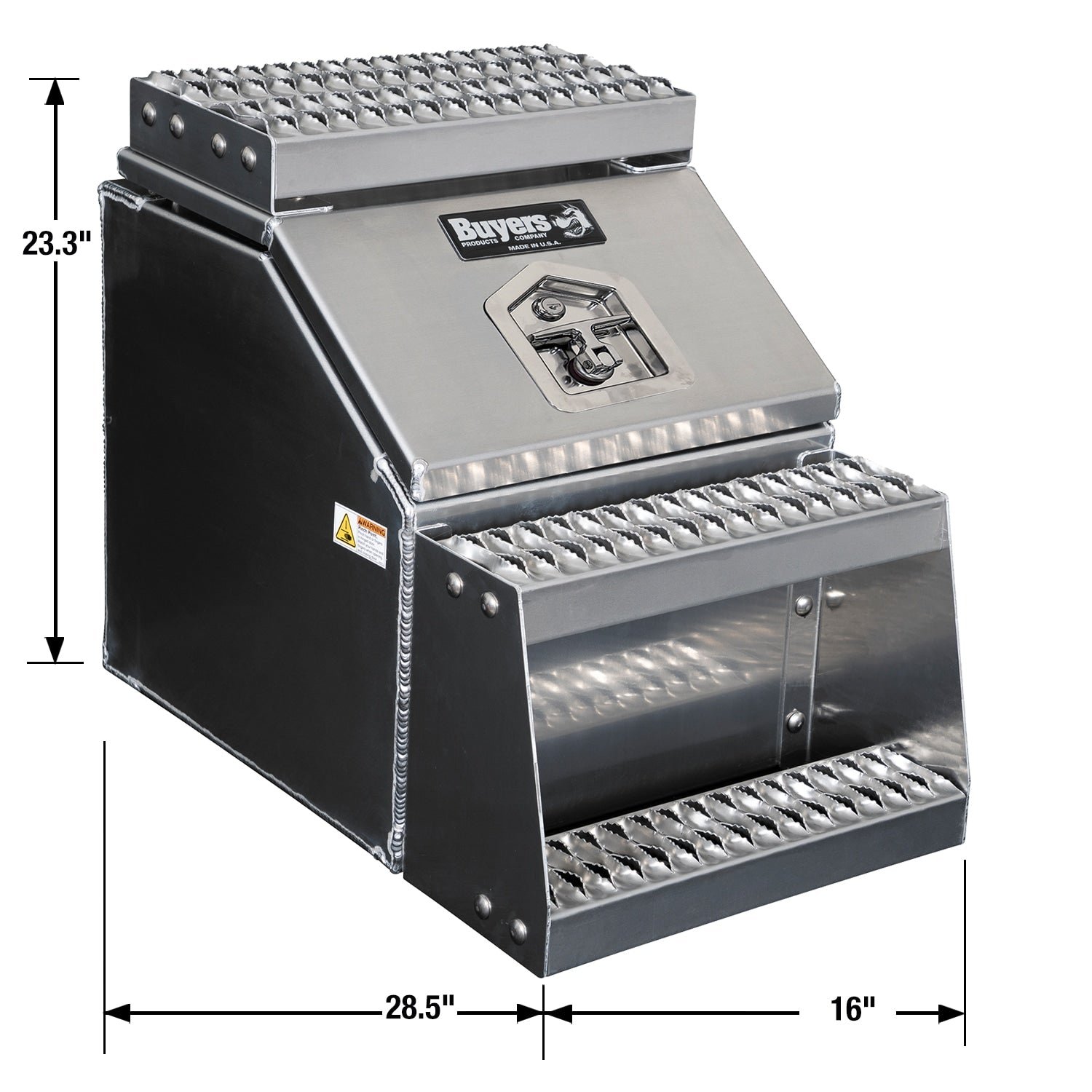 The design is heavy duty but light weight, making the boxes extremely durable without adding a lot of weight to your tractor trailer. The hinge and hardware are constructed of corrosion-resistant stainless steel. An automotive bulb seal and locking, polished stainless steel T-handle latch keep your tools protected from theft. Replaceable grip strut steps provide superior traction in inclement weather and can be swapped out as they wear down.Ultra-wide opening lid makes it easy to store and access equipment on your semi truck.Universal design fits Peterbilt®, Kenworth®, International®, Freightliner®, Western-Star®, Volvo®, and Mack® trucks.Extremely durable 0.125 in thick aluminum construction.Corrosion-resistant stainless steel hinge with heavy duty hinge and stainless steel hardware.Replaceable grip strut steps provide superior traction and can easily swap out as they wear down.Locking, polished stainless steel T-handle latch keeps your tools protected from theft.Automotive bulb seal keeps water and dirt out of your box.Easy to install on your tractor trailer frame rail, For boxes wider than 18 inches, Buyers recommends using 1701015 Steel Mounting Brackets to prevent stress cracksMade in the USA.CA Residents: Prop 65 Warning(s)