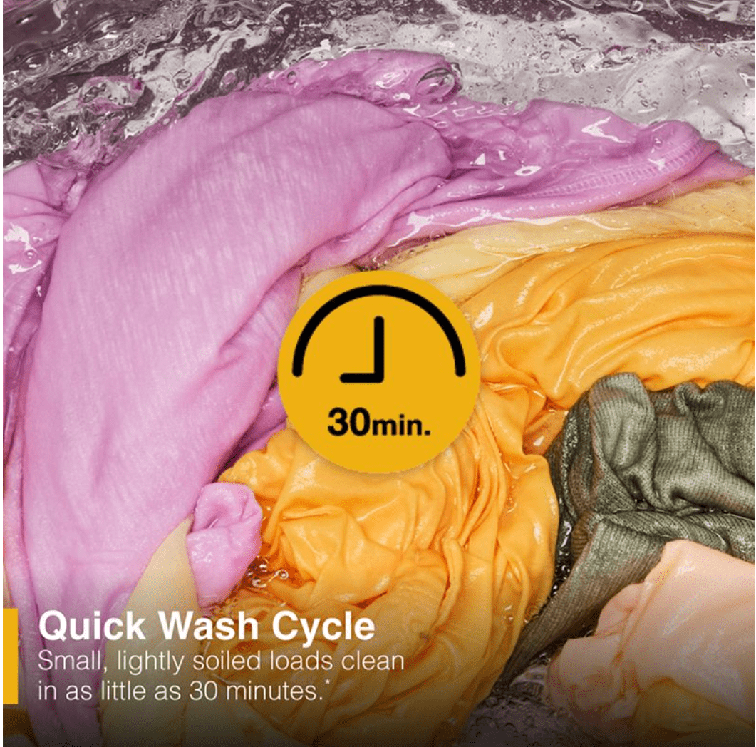 - Quick Wash Cycle – Cleans small, lightly soiled loads in as little as 30 minutes.* Based on a 3-lb load