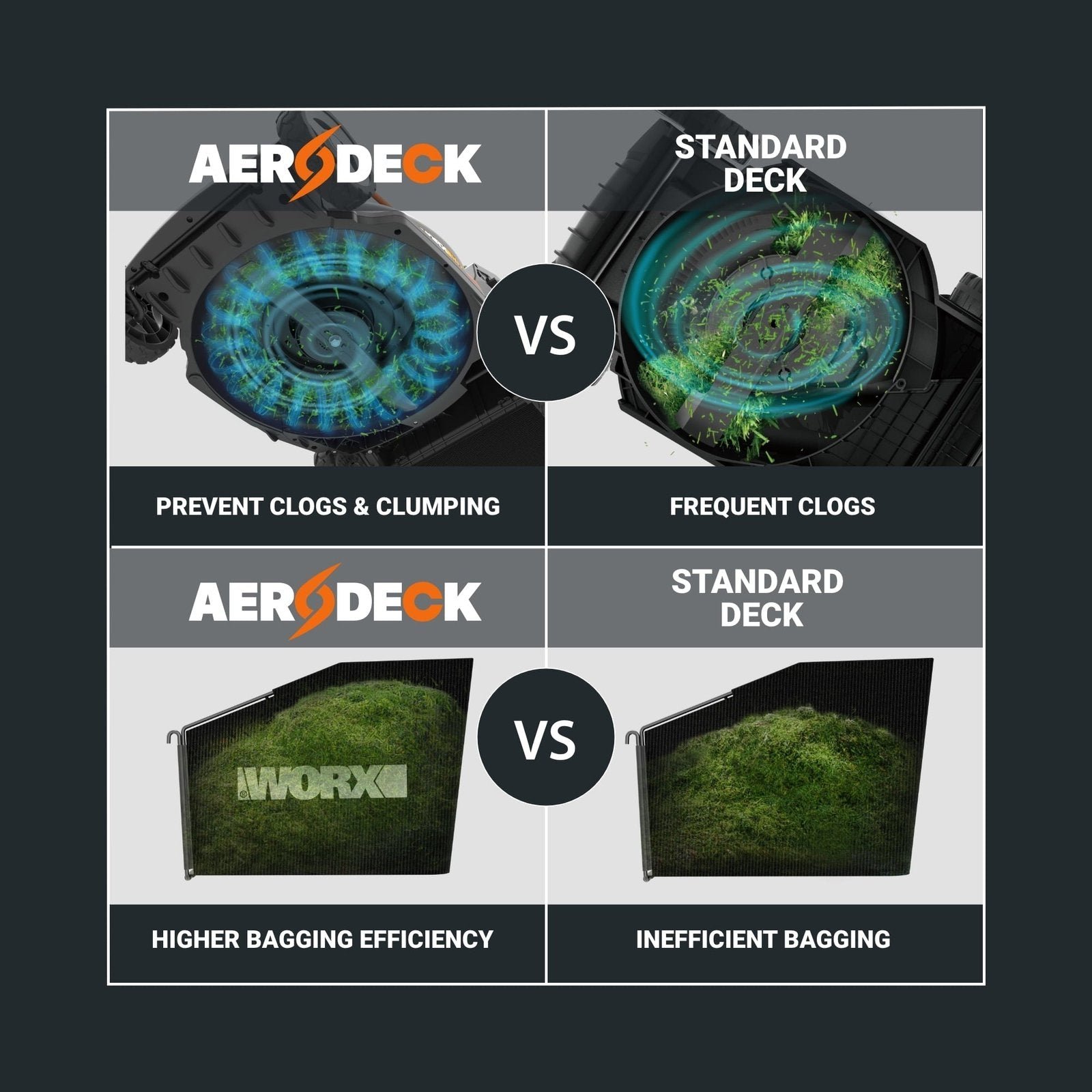 - Aerodeck with vented airflow prevents clumping and clogging in cutting deck, enhances cut quality, and maximizes bag collection.