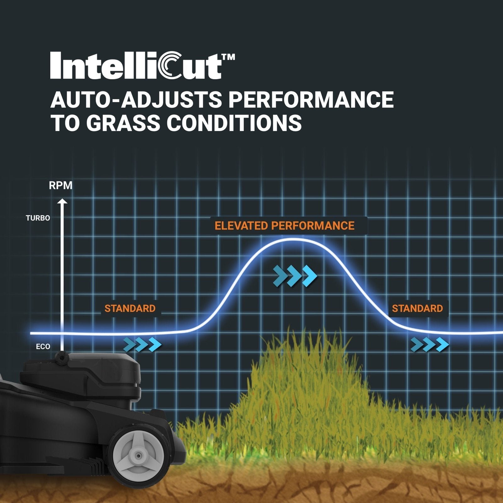 - IntelliCut™ automatically adjusts cutting speed based on grass conditions to optimize performance and runtime.